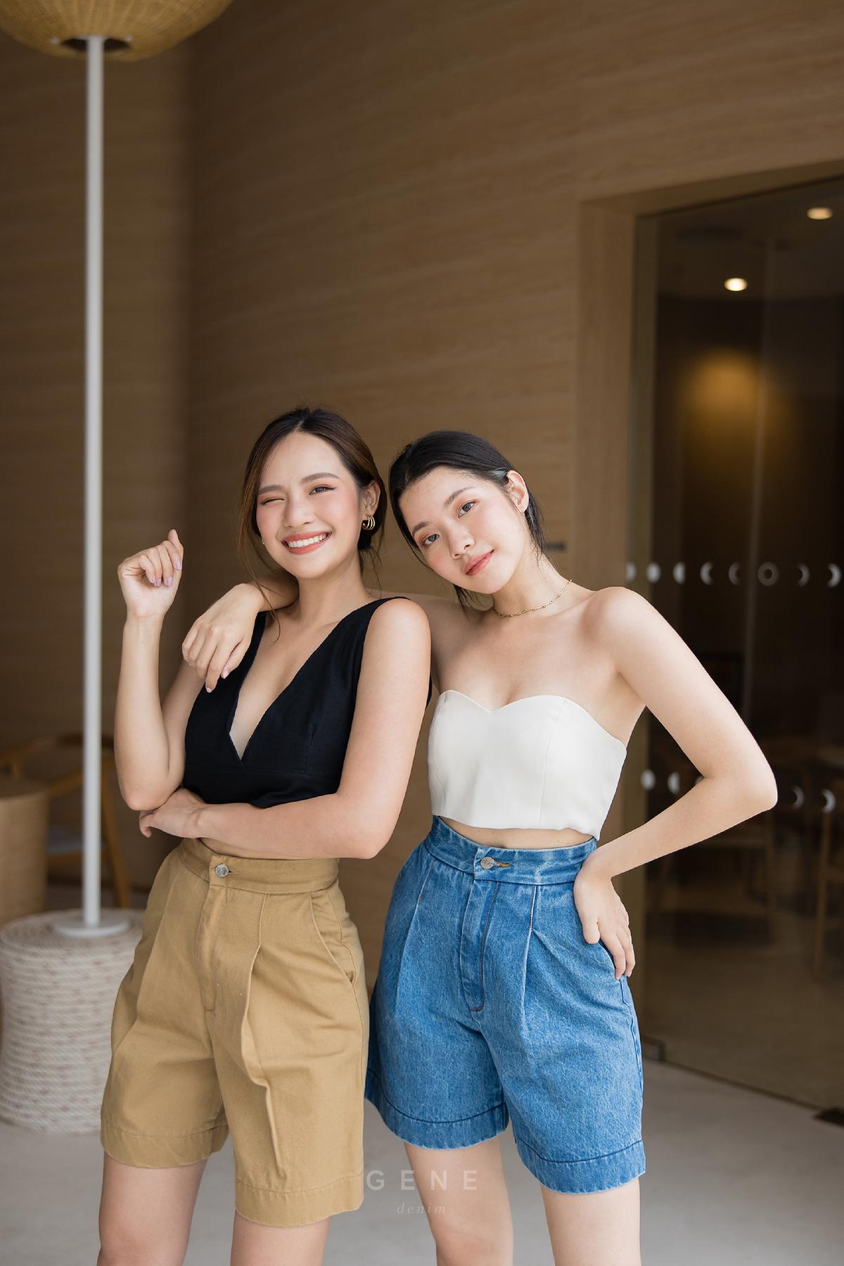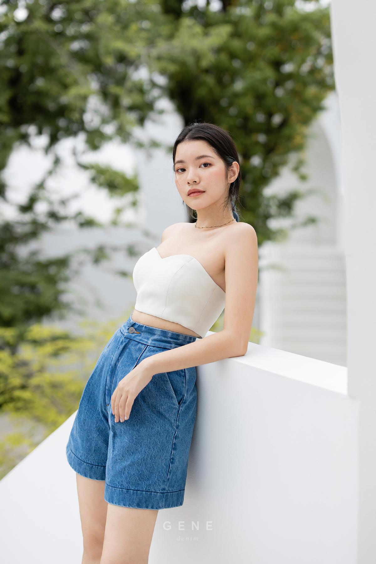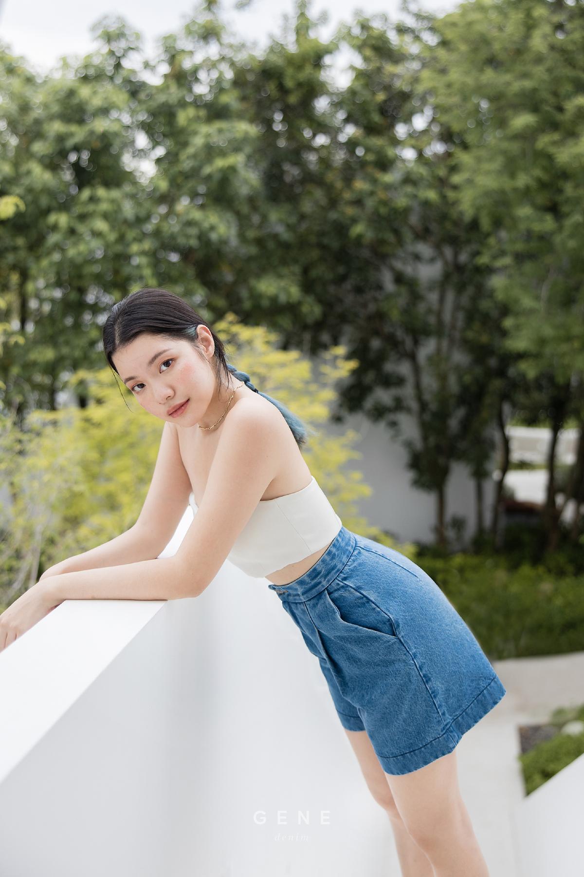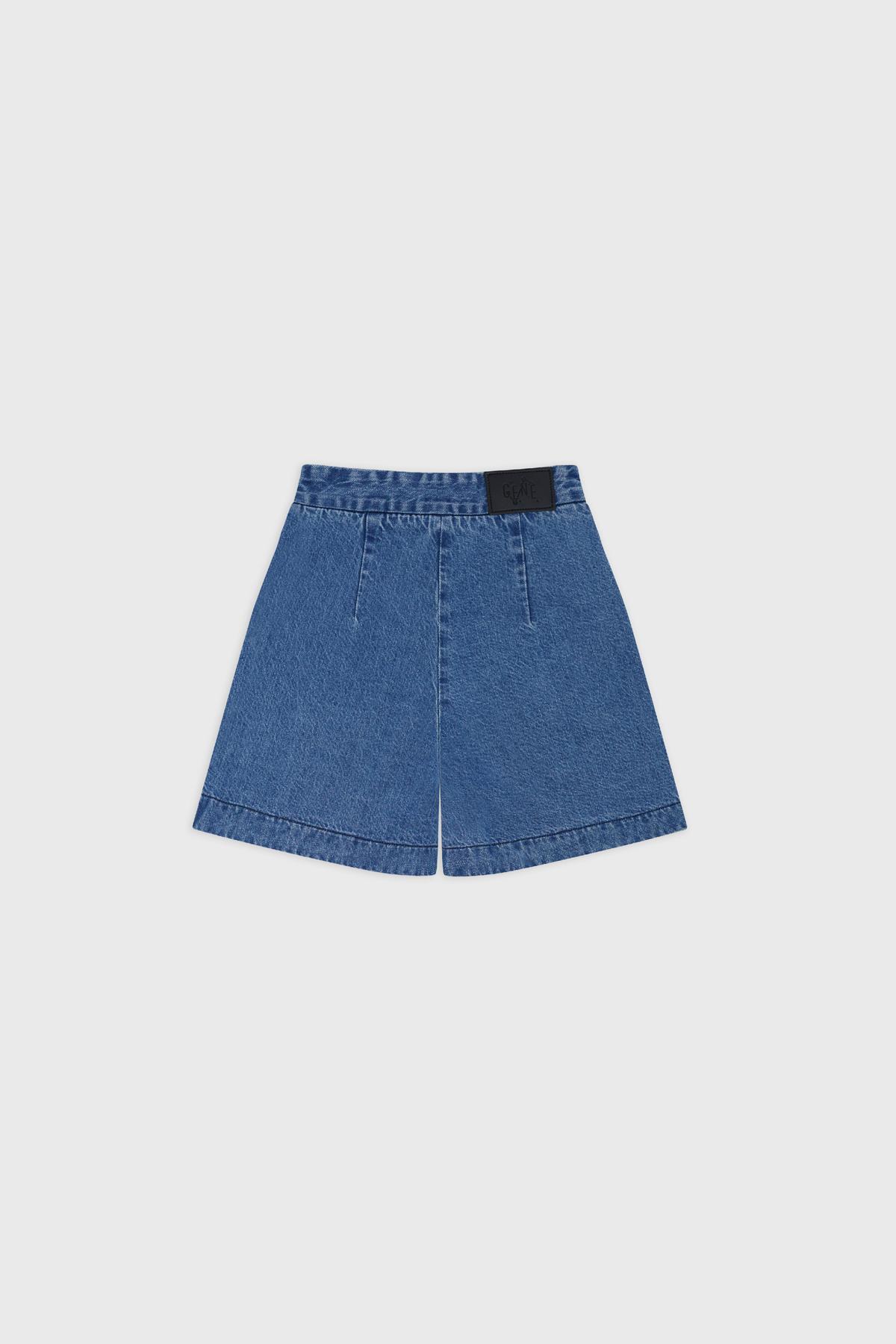 18-inch length with high-waisted, non-stretch shorts in denim blue with pressed-crease and wide legs