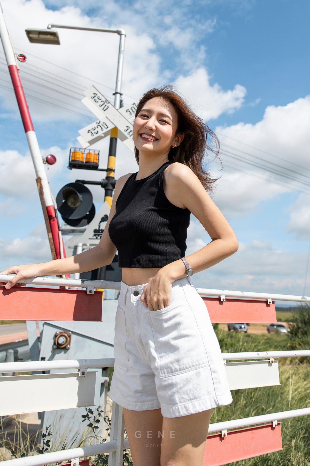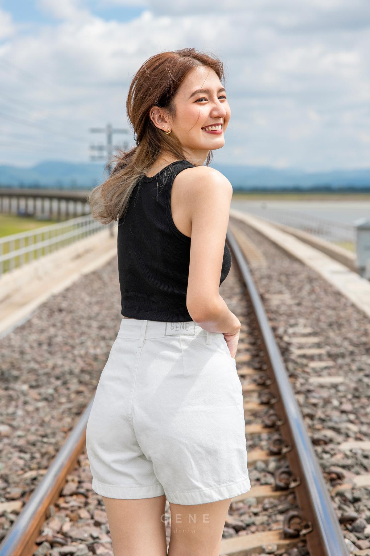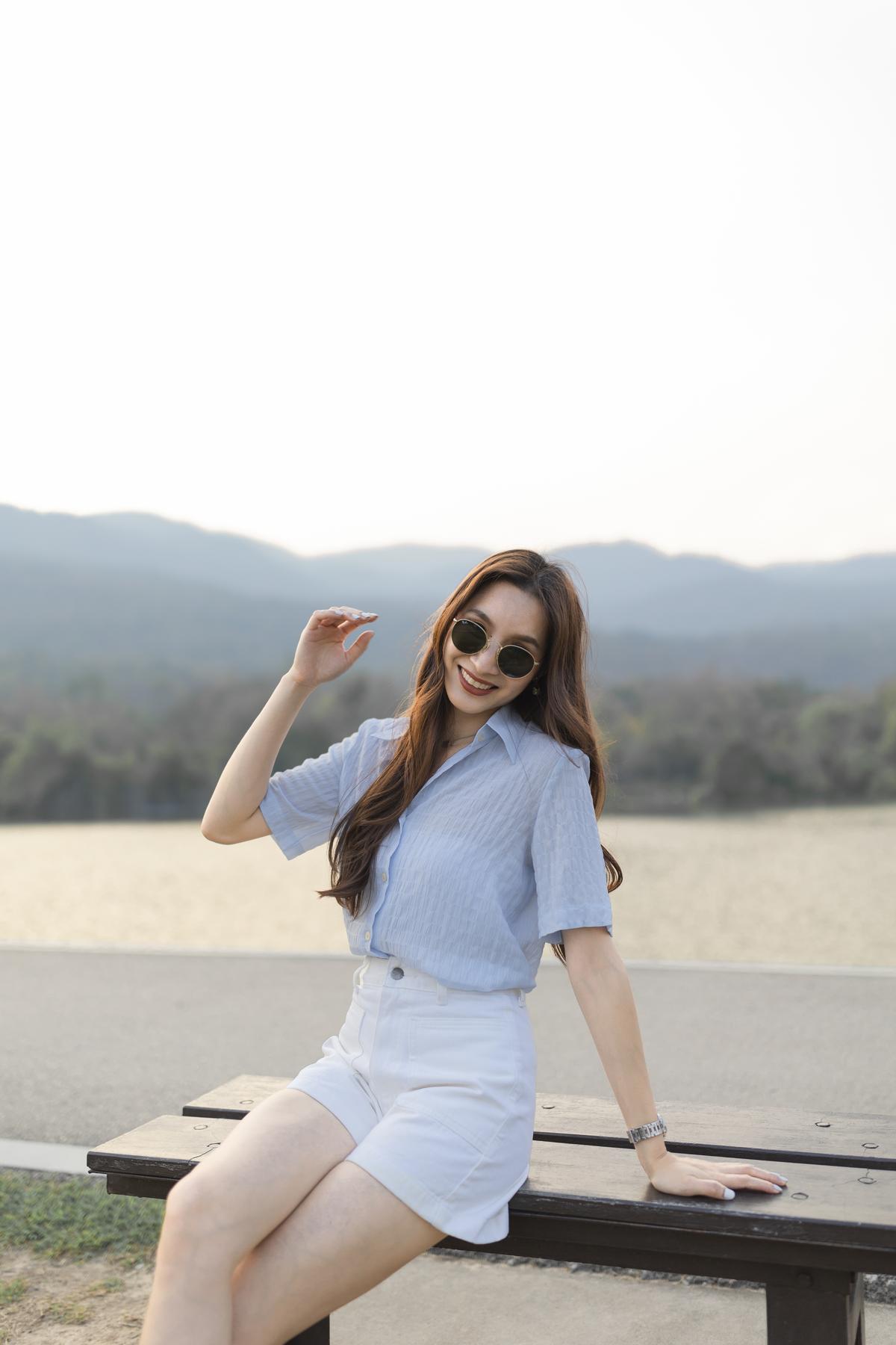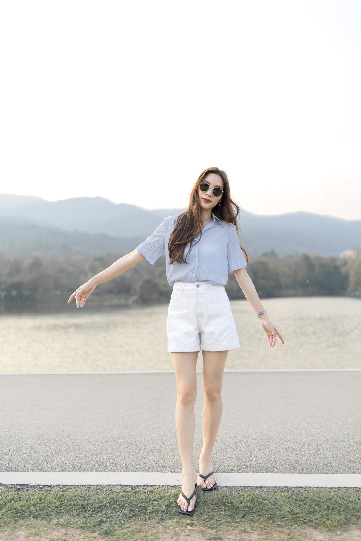 15-inch length high-waisted stretch shorts in light blue with front pockets